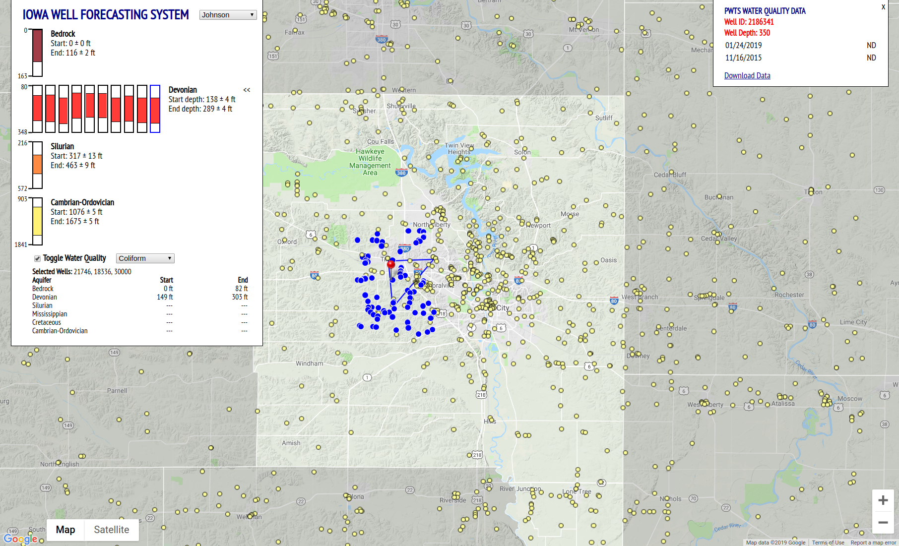 The Iowa Well Forecasting System (IWFoS) is a web platform developed by the University of Iowa Hydroinformatics Lab (UIHI Lab), the Iowa Geological Society (IGS), and the Center for Health Effects of Environmental Contamination (CHEEC) at the University of Iowa. IWFoS provides a user-friendly and interactive environment for Iowa regarding well information, including aquifer depths and water quality. This historical data is available in IWFoS through publicly available data from the Iowa Department of Natural Resources, including water quality from the Private Well Tracking System and well geology from GeoSAM. Because the intent of IWFoS is to better inform the drilling of new wells, we include information from these databases regardless of whether the wells shown are still active so as to provide as much data as possible to improve decision making. This is a beta version which in actively being developed. Its functions and all information are provided on an "as is" and "as available" basis.